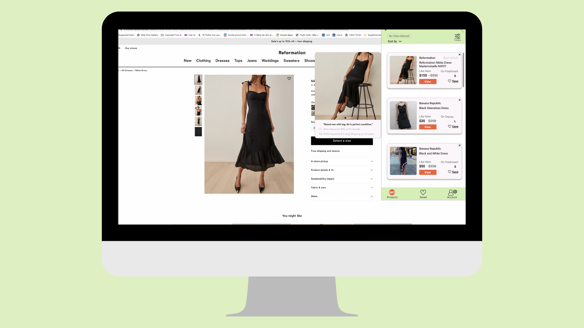 Based on research, our Beta features include the ability to filter by size, color, brand, and condition, sort by price, have a bigger display screen option, save items, see a product’s best match, have a user account, and see a popup reminder with a sustainability message.